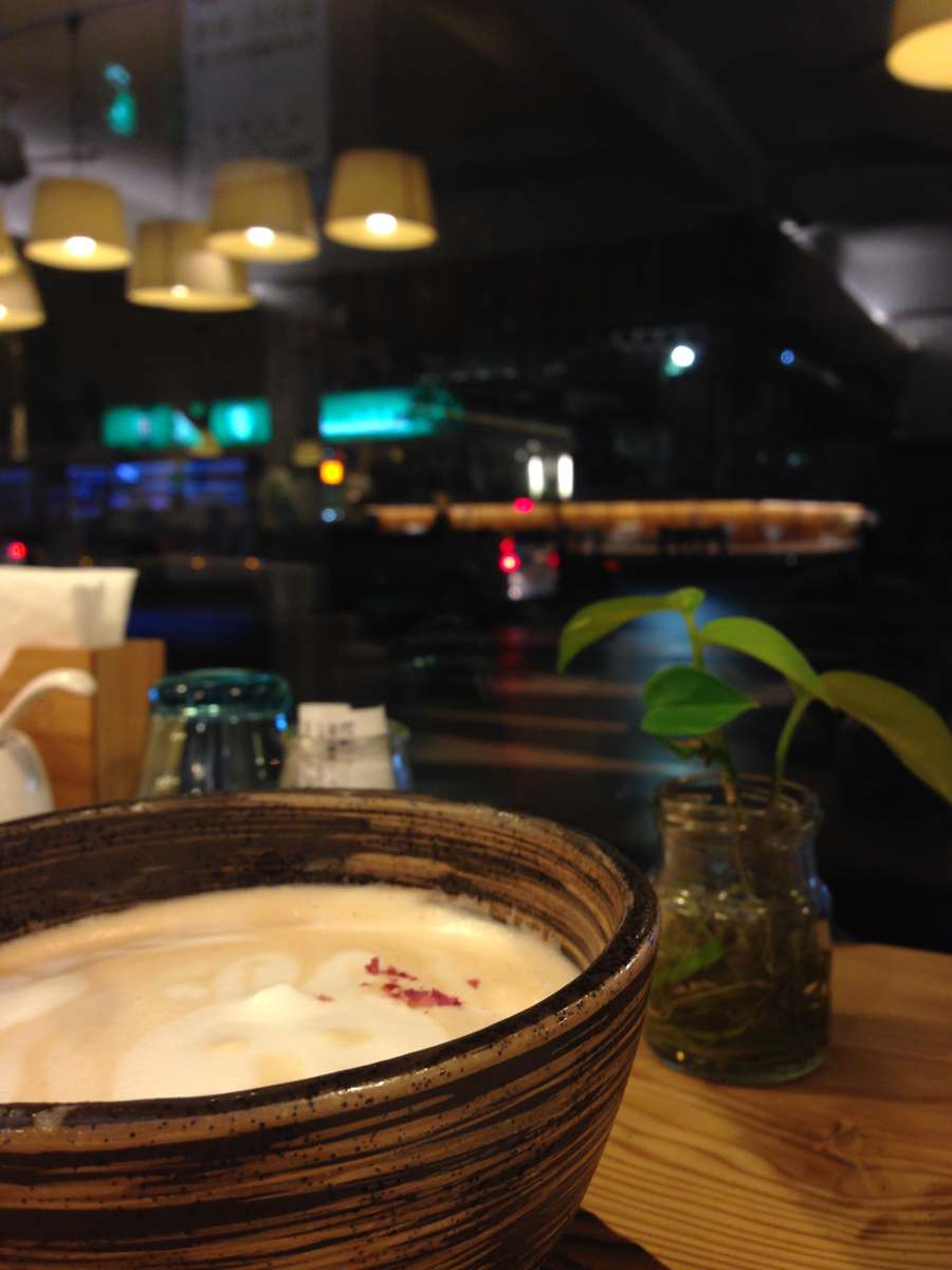 The cake is terrible, the rose latte is delightful, as is the wooden bowl. The place opens later than most.