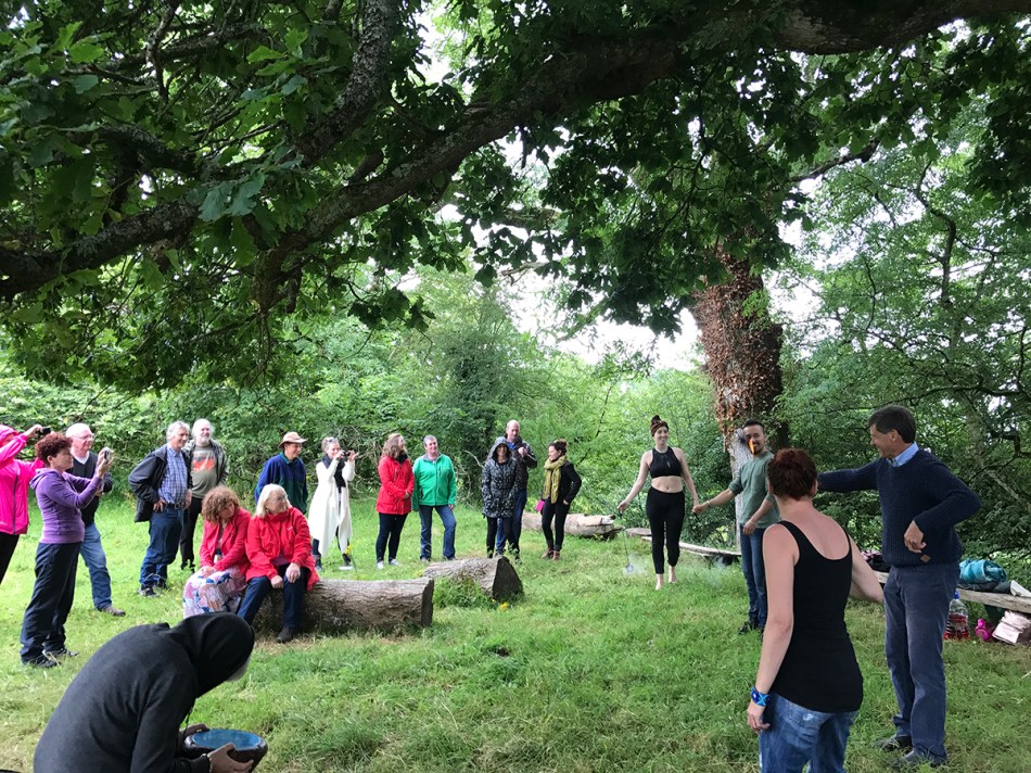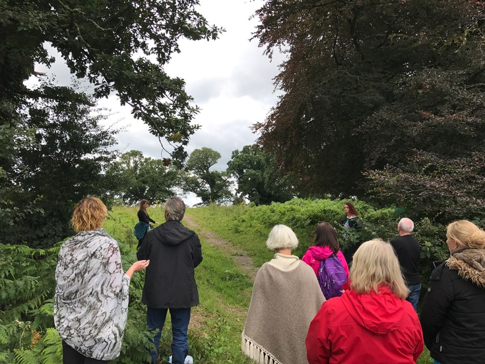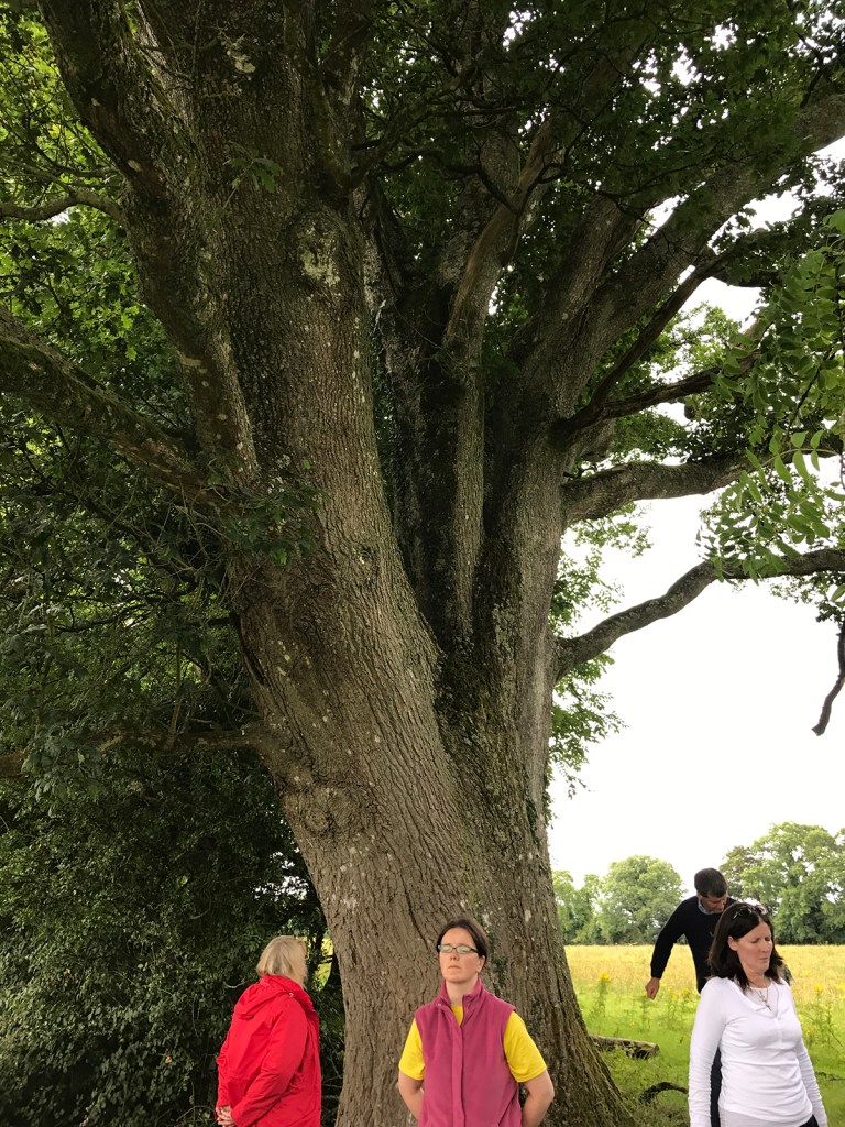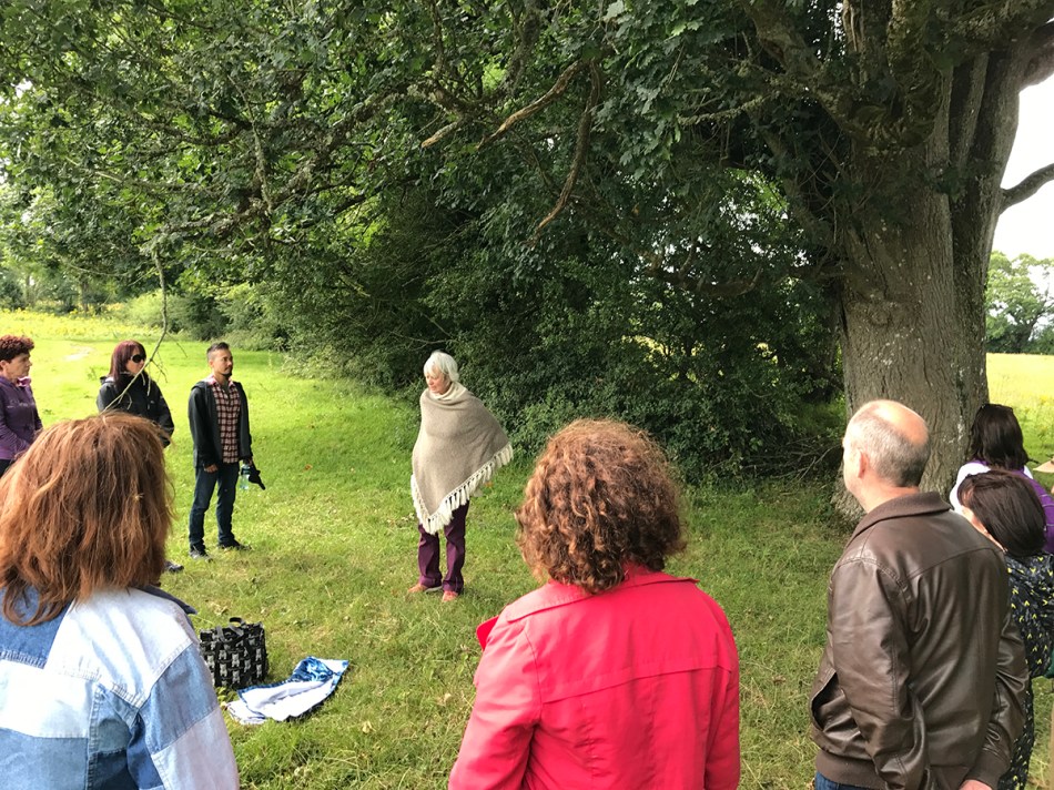 這片山丘推測在古早時期是做儀式用途的,也有當地人稱的精靈塚,因此大家是以尊敬的心情踩踏而入的。我們選在一棵很大的 copper beech(應該跟 Coole Park 的簽名樹一樣的吧)集體做了 Ascendents and Descendents Group Ritual to Relate to the Fairy World,算是與精靈世界打招呼,請求進入。在這放慢腳步的動作中,用英文講是「put ourselves into perspective」,想著前面有多少來者、往後又有多少後代,一直與這片自然相處,而我們人類成就視為不足道、維護它是任重道遠。