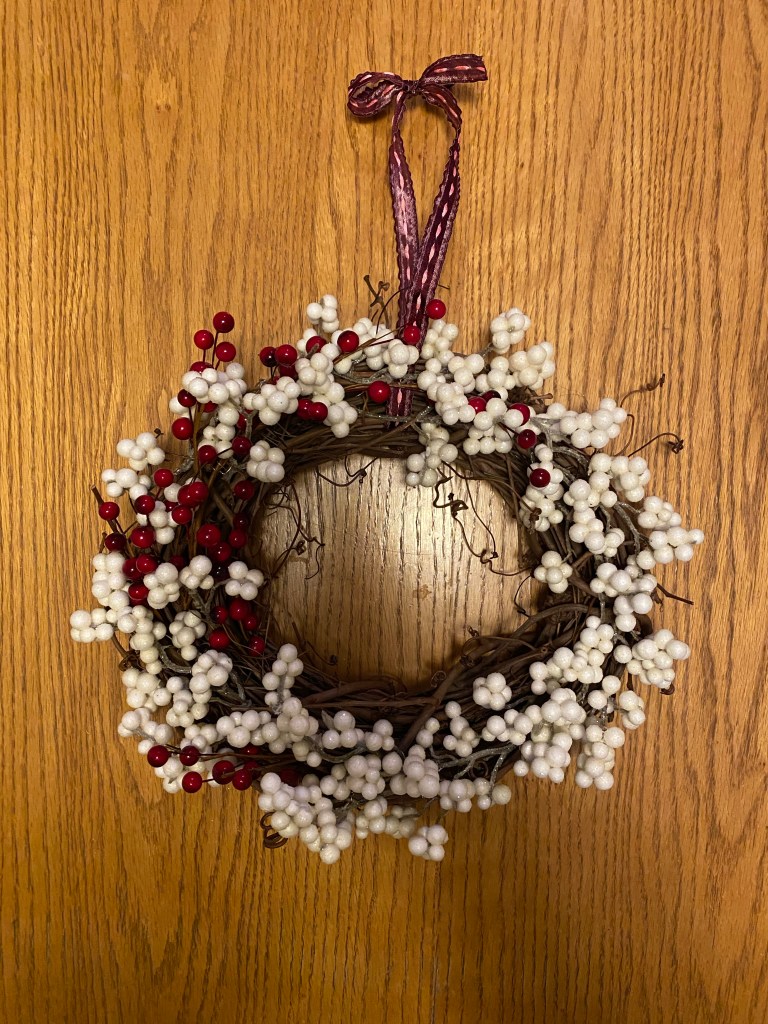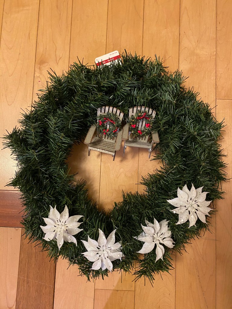 心知肚明要找來一截原木恐怕不容易。去花藝店問了,店員說,我以前賣漂流木的,現在不幹了,噯,再也不幹了!似乎有許多糾結啊。店裡不賣,五金行也只是賣柴火,是否現在除了去公地「偷」,很難找到「合法」的木樁?總之,我沒時間去思考哪裡能取得樹幹跟新鮮枝段(店家們配合疫情措施,營業時間也手忙腳亂),倒是做了聖誕圈,用了葡萄藤圈和和松樹葉等兩基底做了風格大不同的兩個花圈。