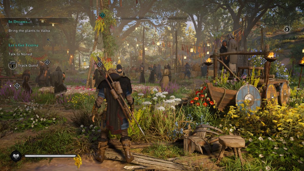 因為刺客信條遊戲裡有春天限定的Ostara活動,我們就討論主角Eivor是不是也很開心在慶祝春天。我覺得根據她的表情跟話語,應該是對於村民如此大肆慶祝感到很趣味,她自己應該普普吧。她可是來自挪威的黑鴉氏族的維京領導者耶!但他是愛屋及屋型,應該看著村子快樂,便也甘願慶祝。