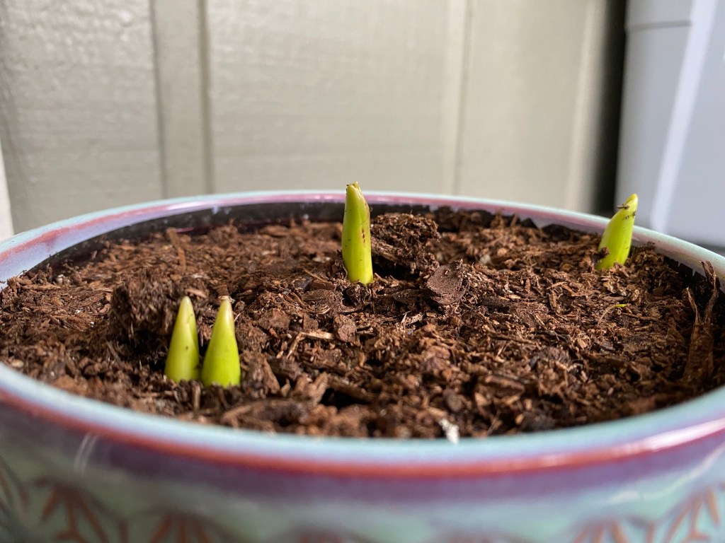 2020年我剛搬家時,男友送了市售的一盆鬱金香,開得很漂亮。謝了之後,我為了把這個禮物感受到極致,便研究了如何讓花明年再開(因為花謝了之後,我才發現裡面有好幾個球莖,嚇了我一跳)。調查了才發現,市售的鬱金香通常都不會再開,但我還是照著步驟,把球莖包好,放在寒冷的黑暗處,等來年春天再放進土裡。今年春天,我才發現,原來鬱金香在秋冬早該放進土裡的,但抱著些許期望還是在三月給他種下去。想不到,在春分這個禮拜真的見到新芽冒出來了!我覺得用新的角度見證到了植物的奇蹟!