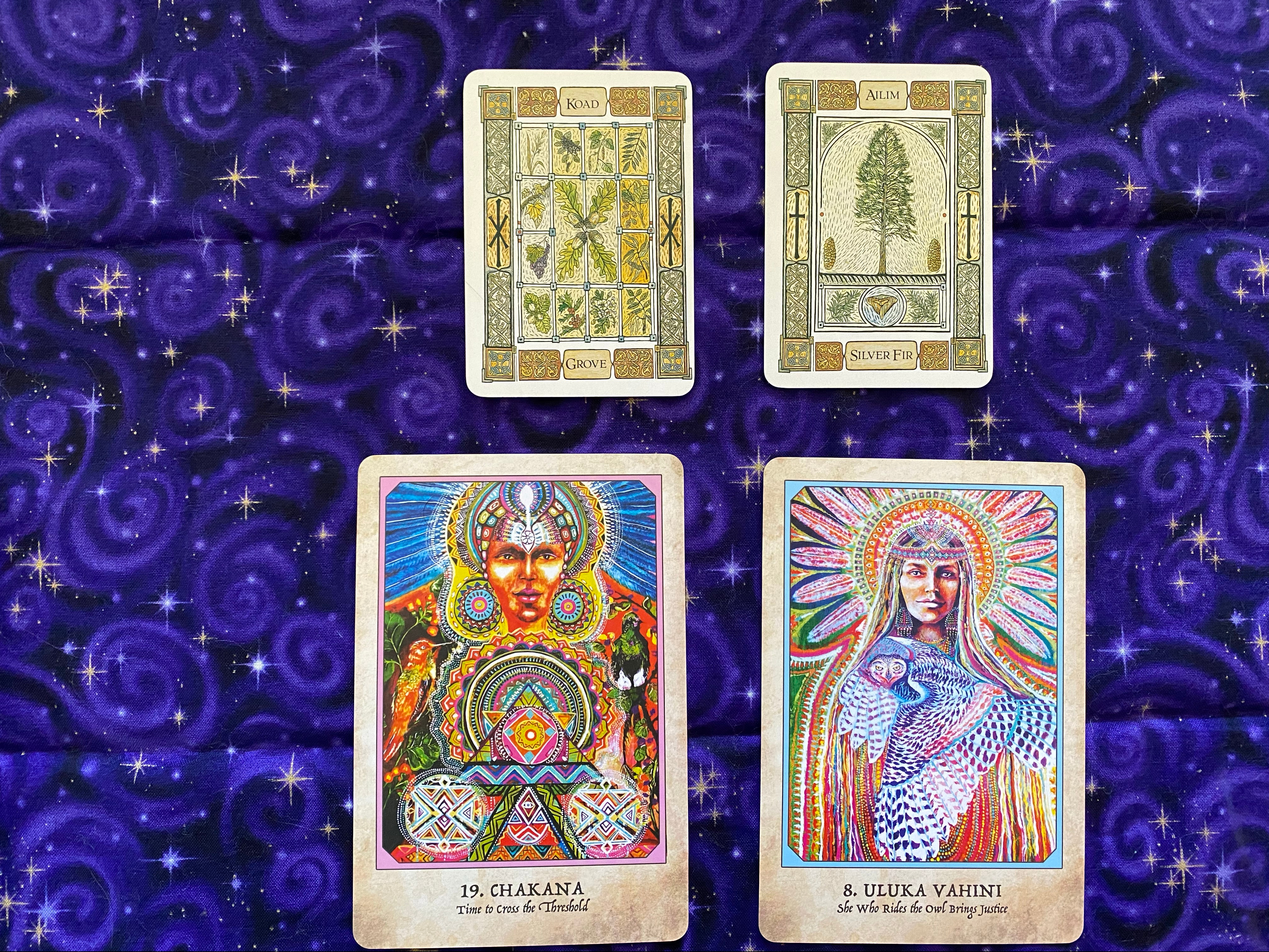 This is what I got: the oghams koad (grove) and ailim (silver fir), and Chakana and Uluka Vahini.