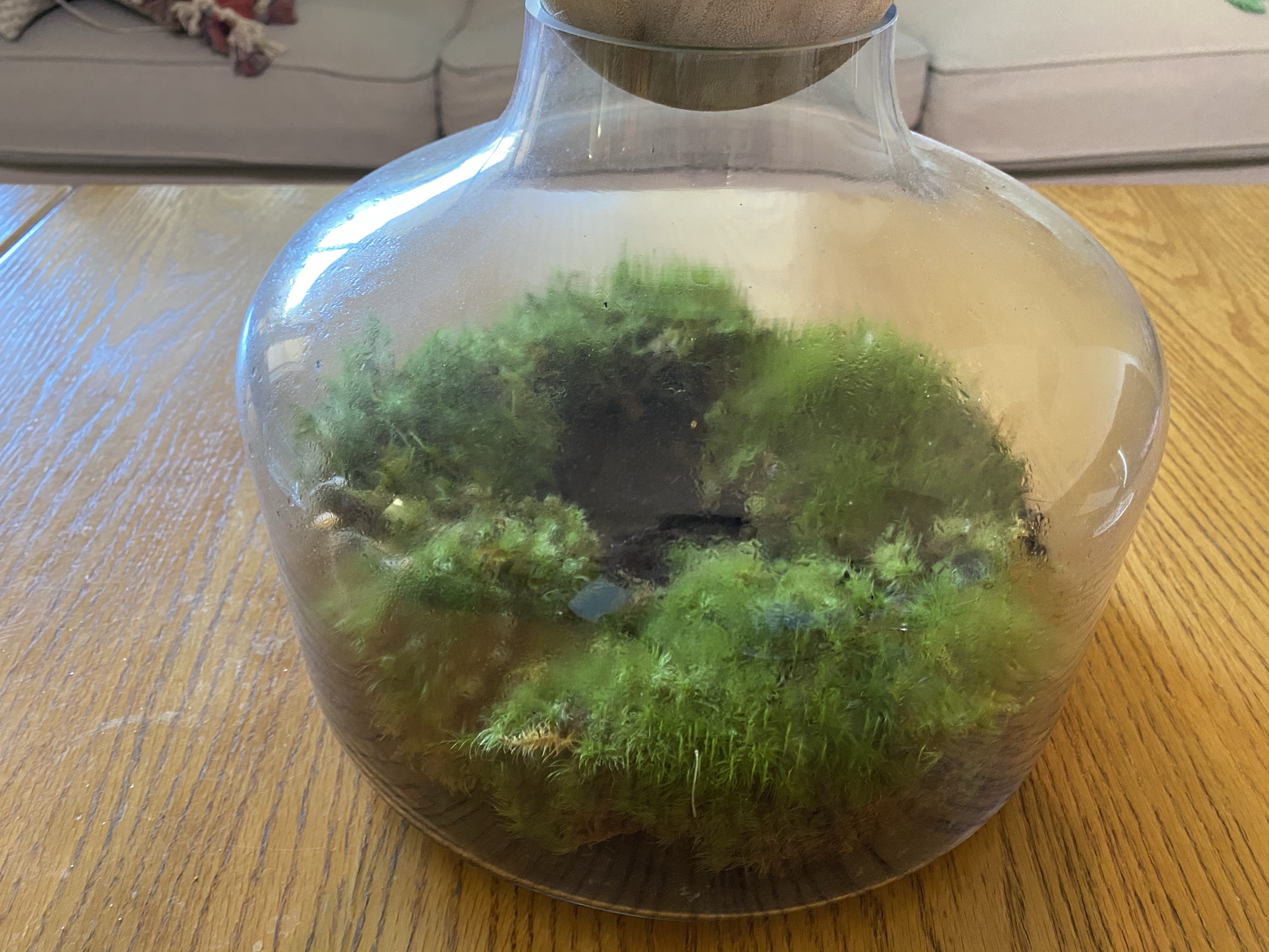 對所有這些植物,我期望能花最低精力養活他們,鮮少上網查資料或查看如何照顧。剛開始會查如何選適當大小的花瓶,那些植物瓶底需要洞洞,還有如何自動澆水(繼續偷懶。其實是擔心不在家的時候如何不乾死他們)。後來,還是偶爾會看一下Youtuber分享撇步。後來,阿丹買了一坨苔蘚,放在玻璃瓶裡,就想看一團毛茸茸的綠(看得出我們很合),但也不輕鬆,很快開始長飛蠅、蘑菇跟雜草。