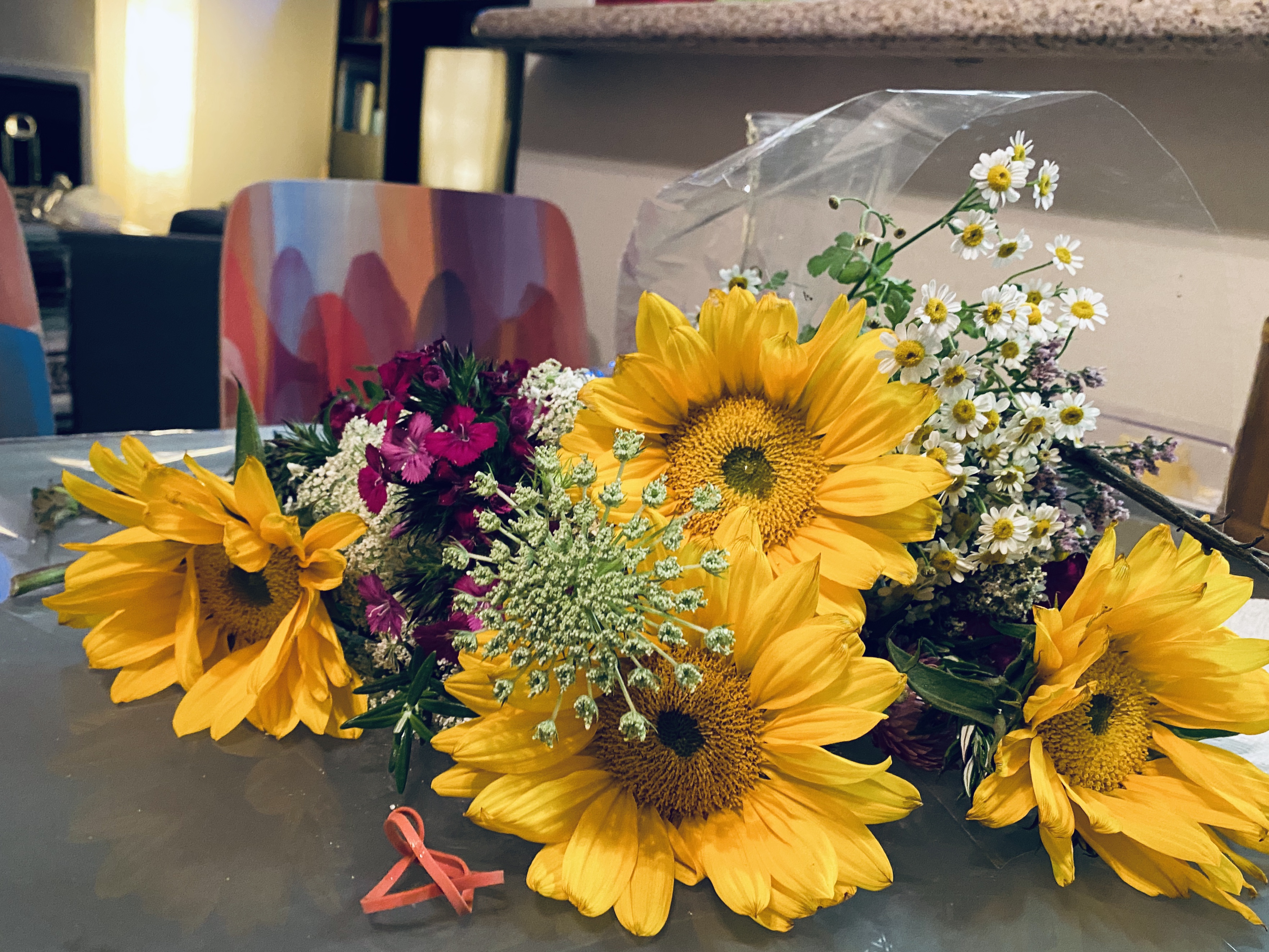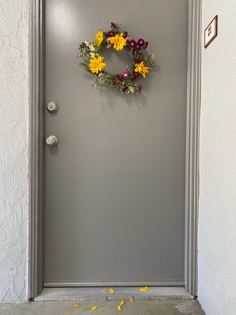 在四十度的高溫烘烤下,本來是多汁鮮花的向日葵花束,在外面掛了兩天就陣亡,變成貧脊的乾燥花環,筋骨畢現。還是很漂亮啊!不得不說,我果然還是秋冬的孩子,終於給我熬過春天,苦苦稱到夏至了,讓我們朝衰老邁進吧(是否太快了。)
