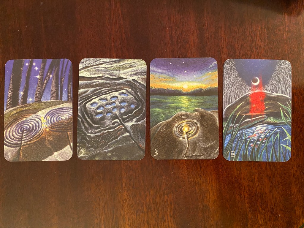 他以為這事就這麼了結了,但是在2017年又在腦海中聽到精靈說,我們是Sidhe,我們又來了,這次要你來做一套神諭卡,叫做Sidhe Oracle of the Shining Moon,創作基礎是蘇格蘭及愛爾蘭各地石墓遺跡上的符號。