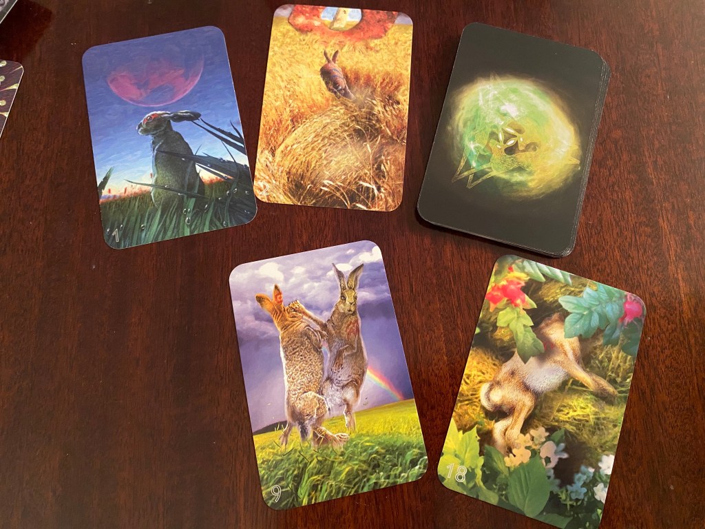 他找來了創作過塔羅排的畫家朋友,兩人開始大量翻書找出各地的石刻照片,一個一個看,然後如果圖像是精靈要的,他們就會能量上點個頭、推一把這樣,最後總共畫了四十副圖片。2018年出版後,兩人覺得大功造成,但結果同一年精靈又來了,說下一套卡片叫做Sidhe Oracle of the Fleeting Hare。這回他內心很快看到四個兔子的畫面,兩人創作了二十張卡片。兔子既象徵與異世界的連結,也是凱爾特族重要的象徵動物之一。