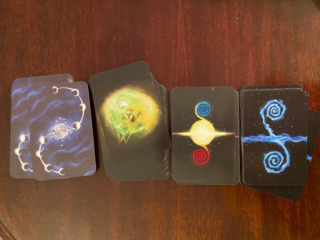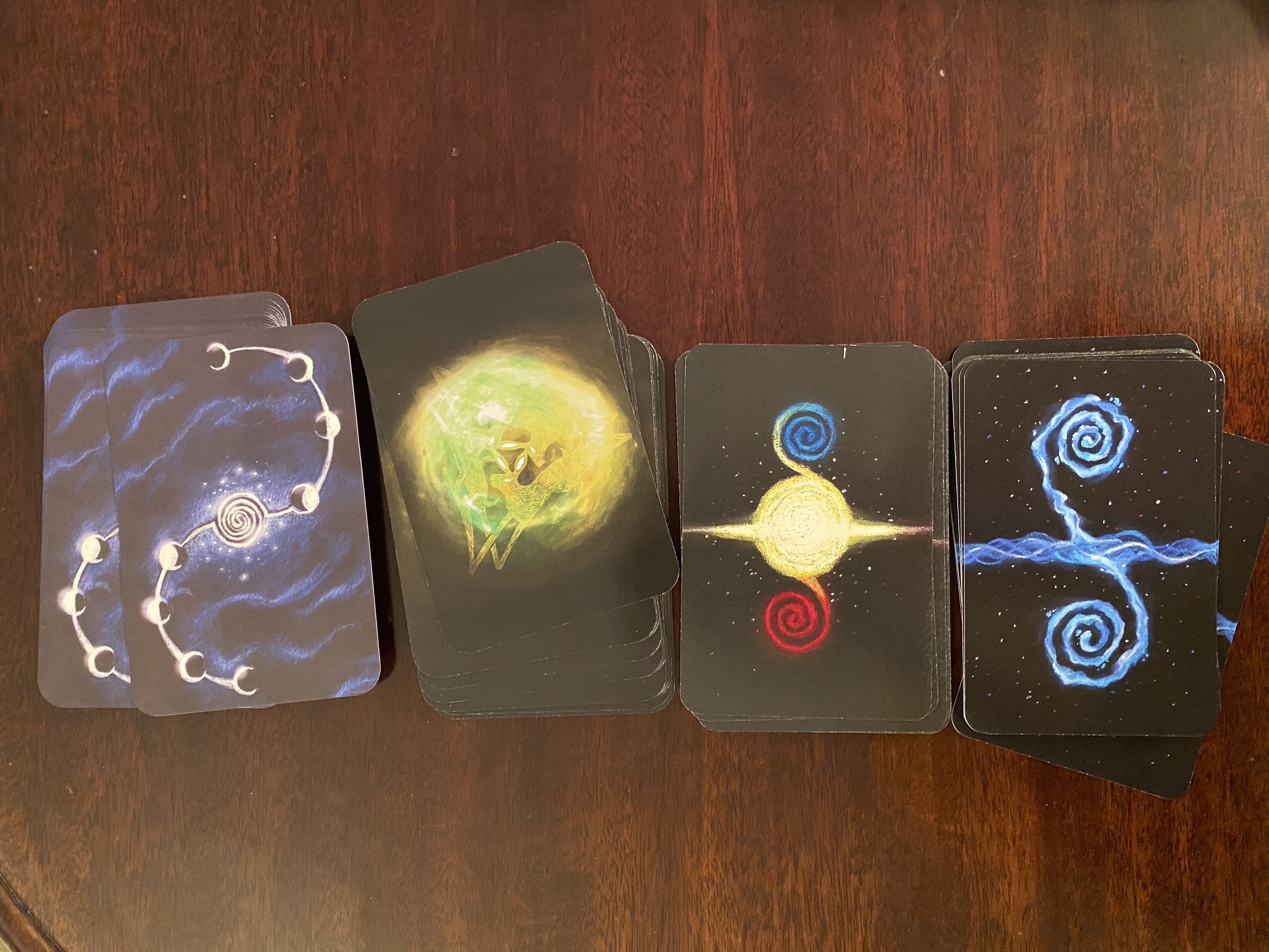 而圖卡方面,最後則有四組,分別是月亮(對應風)、野兔(對應土)、太陽(對應火)、水(對應水)等四個主題。據說當四組排卡聚在一起,就會合成第五個元素,而牌面的意義也將超越本來所屬的主題,在其中能夠見到與其他元素的關係。