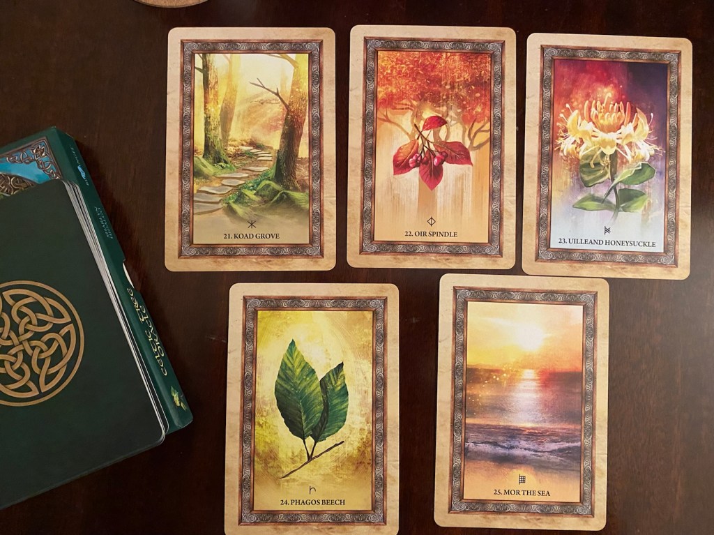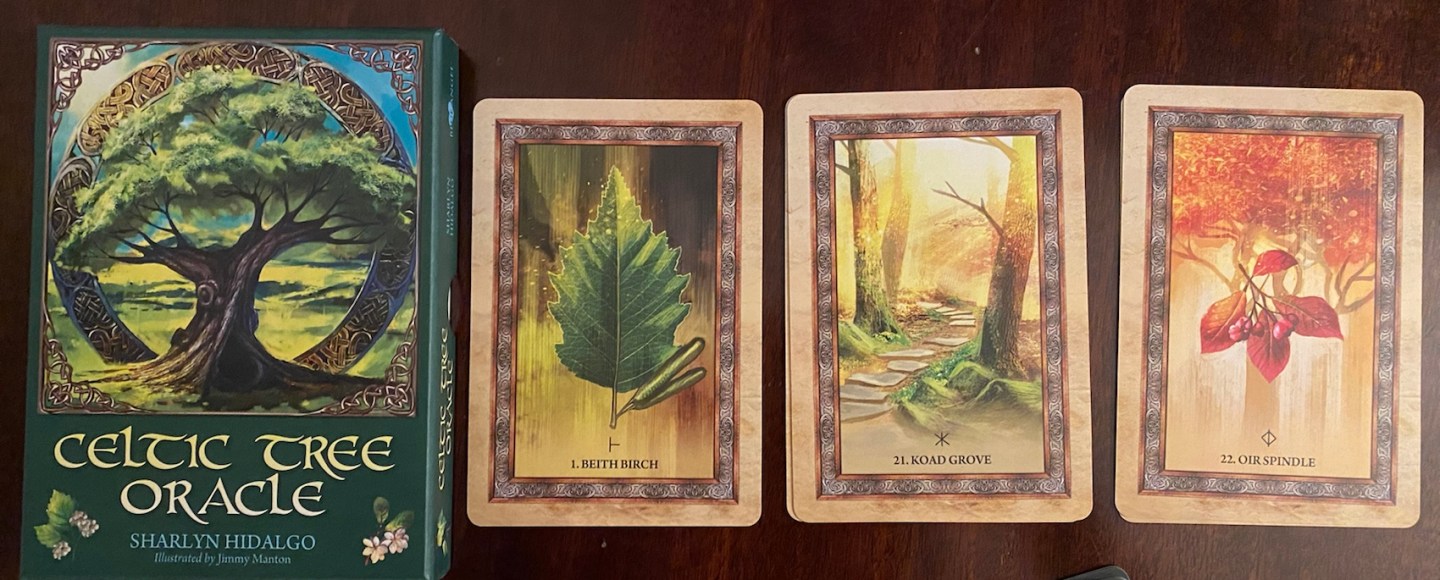 I have many nature decks, ranging from ogham and Celtic tree/plants to sacred nature decks. One deck stood out to me as the most “naturalist” one: The Celtic Tree Oracle by Sharlyn Hidalgo, illustrated by Jimmy Manton.